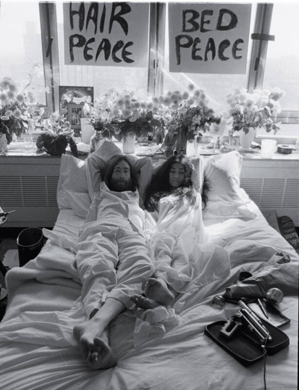 ふたりは交際をはじめ、1969年に結婚した。レノンの妻として一躍時の人となったオノの作品は、それまでは彼女の作品に興味を示さなかった人々にも知られるようになった。レノンとオノは、新婚旅行で訪れたアムステルダムとモントリオールのホテルで「ベッド・イン」と題した平和のためのパフォーマンスを行い、終わりの見えないベトナム戦争に抗議した。座り込みといった非暴力的な抗議活動からヒントを得たふたりはホテルの寝室にジャーナリストたちを招待し、平和について議論した。1970年には巨大広告やポスター、ラジオCM、ポストカードを使ったマルチメディアキャンペーンに打って出、「War Is Over! If You Want It. Love and Peace from John & Yoko」というメッセージを発信するかたわら、「イマジン」を共作した。この曲の歌詞は『グレープフルーツ・ブック』から着想を得たといわれている。当時のオノについて評論家のリンジー・ゾラッズは、2015年に米隔週刊誌『ニューヨーク・マガジン』に次のように寄稿した。「オノの芸術は、前衛の枠を超えたことで命を与えられました。オノには、チェンバーズ・ストリートのロフトで起きていることに詳しいクールなアート好きだけでなく、すべての人の心のなかに眠る芸術家を呼び覚ますという使命があったからです」