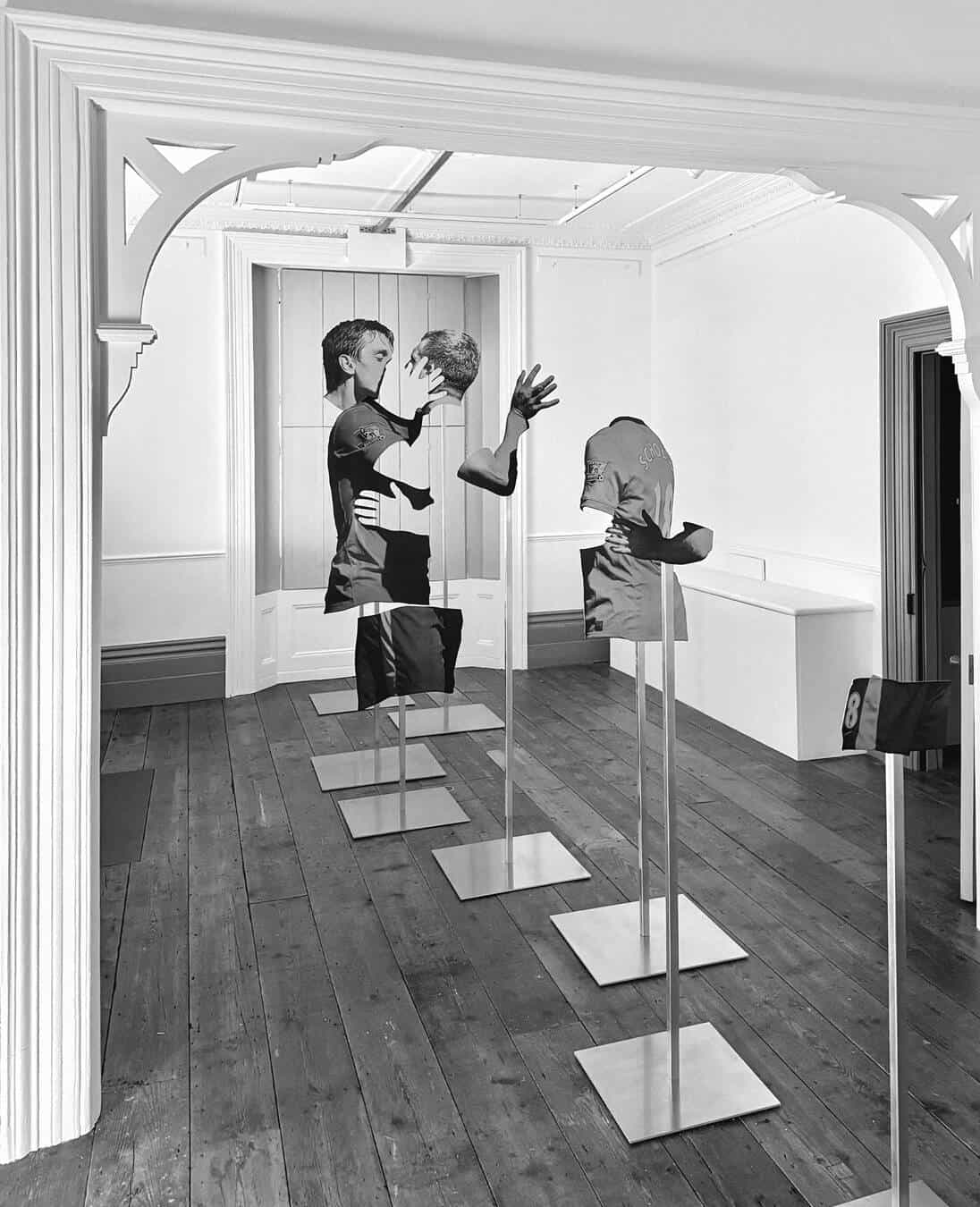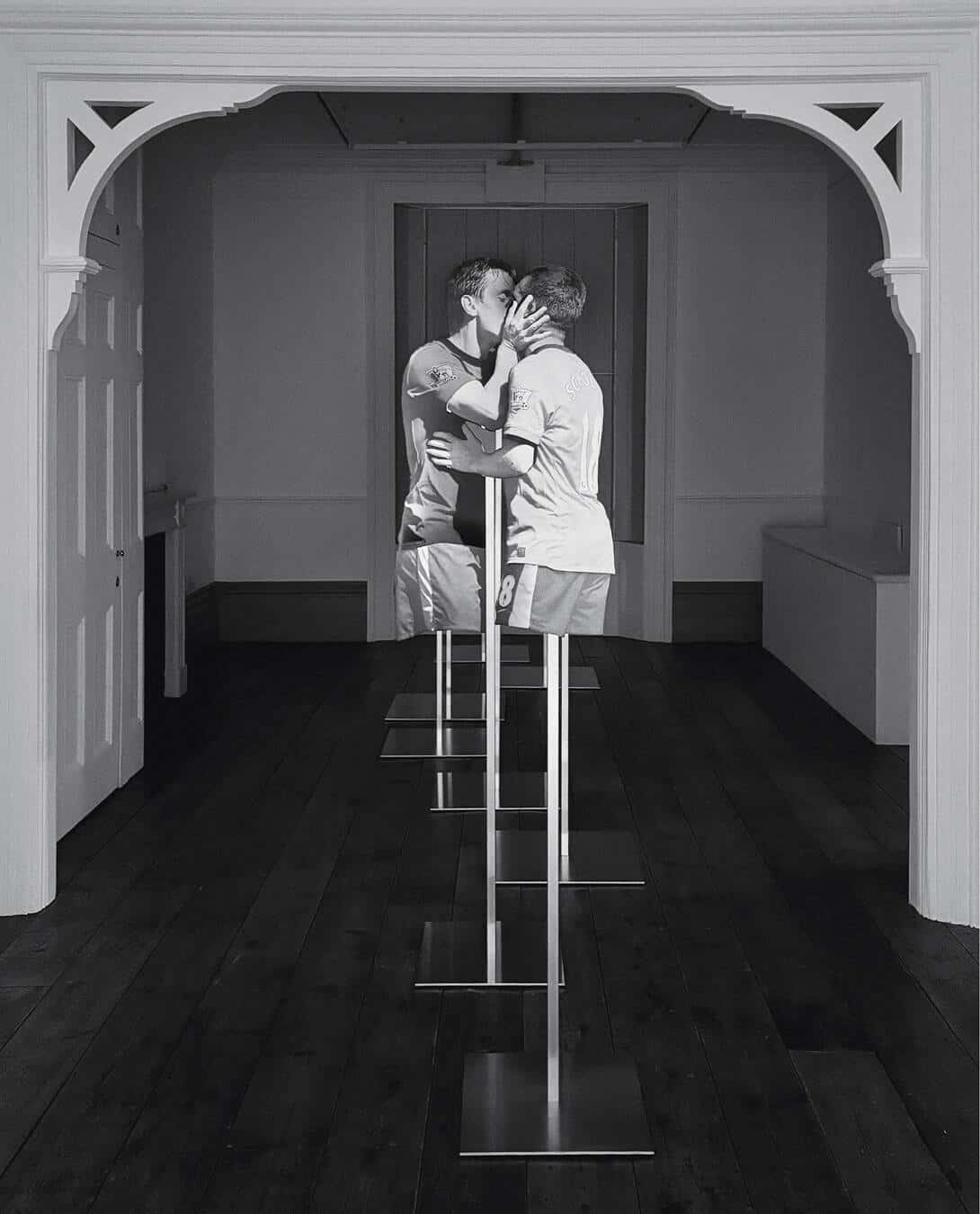 これは自身の作品に感情を吹き込むためにゲストがとる、数多のアプローチのひとつである。ゲストは意識的あるいは無意識的にかかわらず、観る人がホモエロティシズムとゲイコミュニティに関するテーマと直接的に触れ合えるような空間をつくり出すのだ。そう考えると、THE OTHER TEAMへと続く道が5年前にゲストのPC画面上にあったネヴィルとスコールズの写真からはじまったことは、いかにもふさわしいことのように感じられる。「この写真を見て、激しく感情を揺さぶられました。動揺したんです」と言ってゲストは口をつぐんだ。私を案内しながら、白と黒のグラデーションを描くスコールズの肘の前を通り過ぎると「動揺は嫉妬に変わり——最終的には苛立ちとなりました」と再び口を開いた。