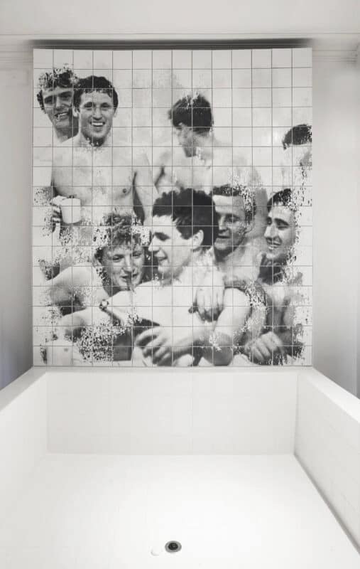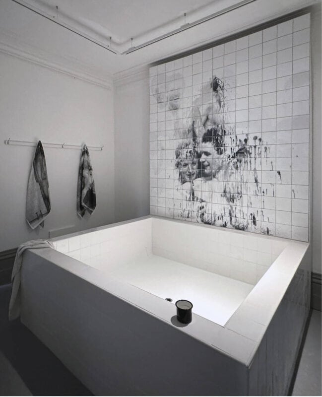 サウナや公衆浴場を思い起こさせる「Splash」では、更衣室によくあるもの——清潔なブリーフや直立したプラスチックのボトル、さらにはタイル張りの広々とした浴槽などを想像してほしい——で構成されている。ゲストが4日かけて完成させたこの部屋には、2本のスプレー塗料が置いてある。それを吹きかけると、試合後の無意識的なじゃれ合いとも、若い男性同士のソフトポルノまがいの行為ともとれる、防水加工されたモザイク画が現れるという仕組みだ(モザイクの解釈は、その人の見方次第である)。「選手たちが素っ裸で風呂に入っている姿を昔よくテレビや新聞の裏面で目にした、と母親は言っていましたが——そんなことが本当にあったなんて、とても信じられません」と、ゲストは驚きをにじませながら言葉を添えた。