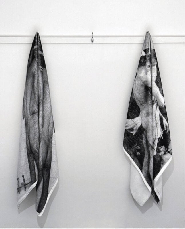 「Glory ‘66」の反対側に展示されているのは、「On Your Parade」という作品。ほかの作品と同様にモノクロームに削ぎ落とされたシャンパンファイトの様子——実際は湯気を立てる小便——が、私たちの希望や幻想を投影するために、祝祭ムードの骨組みだけを残している。冒涜的とも捉えられかねないゲストの手法は、私たちに向けての餞別ないし、ウィットに富んだ最後の挨拶とも解釈できる。