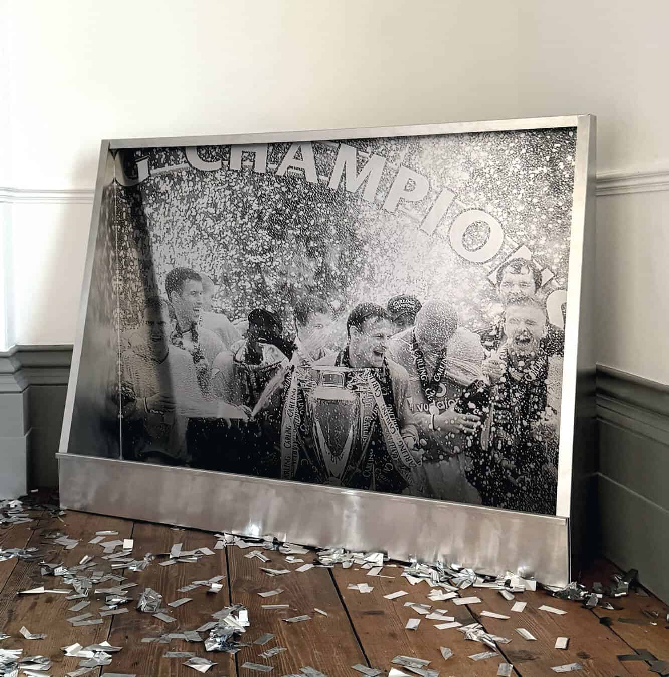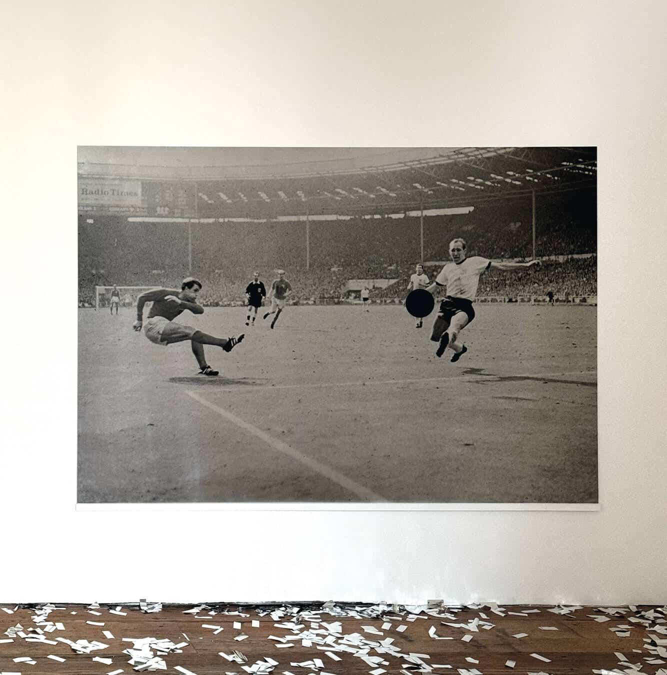 喜びの精神と、それが日常に現れるさまざまな姿にスポットを当てたゲストの“締めの言葉”は、さらにその限界を押し広げようとする。本展のラストを飾る、紙吹雪まみれの暗い部屋に足を踏み入れると、一隅に置かれたスピーカーからブロンスキ・ビート(Bronski Beat)[1980年代に活躍したイギリスのシンセポップ・バンド]の1984年の名曲「Smalltown Boy」のシンセサイザーの音色が聴こえてくる。まるで断末魔の叫びのように引き伸ばされたその音は、パーティーの終わりを告げているのだ。部屋には、1966年のFIFAワールドカップ(W杯)イングランド大会決勝でジェフ・ハーストが優勝ゴールを決めた瞬間の写真をモチーフにした作品「Glory ‘66」が展示されてある。だが、ここでも違和感を抱かずにいられない。原因はグレースケールの画像でもなければ、インダストリアルな雰囲気が漂うメタリックな光沢でもない。そこにはなんと、本来ならボールが写っているべきところに、直径9センチほどの“グローリーホール”がぽっかりと開いているのだ。