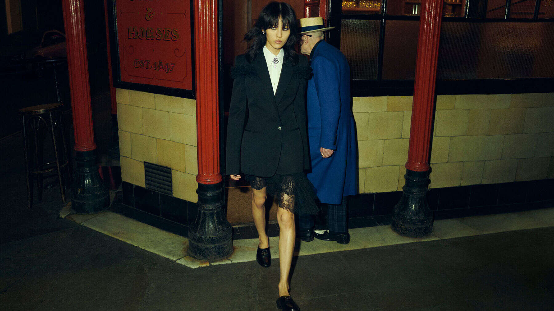 キャンペーンを撮影したのは、フォトグラファーのテオ・シオン(Theo Sion)。何か目的があるかのように、カウンターカルチャーと伝統が融け合う、1950年代を象徴するソーホーの老舗パブ、ザ・コーチ&ホーセズ(The Coach & Horses)に颯爽と集まるモデルたちの姿をとらえた。男性モデルが海軍を想起させるテーラーリングを再解釈した装いでダンディなパブの常連客に扮するかたわら、女性モデルはトリムにレースがあしらわれたサテンのスリップドレスやストラクチャードドレス、シャープなテーラーリングが際立つ装いで、ぼんやりとした光の中を行き来する。そんな人々の引き締まったシルエットに、かすかな光沢が張りつめる。メタリックブイヨンで描かれたタトゥーとツイストされたビューグルビーズをまとったボディスーツもあれば、ダークインディゴのデニムの上にゆったりと羽織られたブラウスもある。Tバーのミュールや1950年代のサブカルブーツ、思い出の品のように抱えられたスカルフラワーモチーフのバッグなど、アクセサリーにも当時の雰囲気が投影されている。モデルたちに加えて、地元の有名人であるソーホー・ジョージ(Soho George)がコーヒーカップを手にシンガーのフローレンス・ジョエル(Florence Joelle)とともにカメラに収まるなど、ひとつひとつのカットがソーホーの“いま”を讃えている。